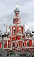 | Iglesias pilar octagonales | La iglesia «octógono en un cubo» se transforma en una ornamentada iglesia torre que no guarda similitud con la tradición arquitectónica bizantina (ver: Torre Menshikov) |