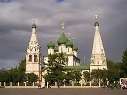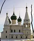 | Combinaciones de cúpulas de cebolla y carpadas | Una iglesia arcaizante de cuatro pilares sobre una base elevada con cinco grandes cúpulas de cebolla que está rodeada por una galería cerrada que conduce a varias capillas, porches, y campanarios de varias formas y tamaños. | Yaroslavl y región del Alto Volga, desde la década de 1640 hasta los años 1680 | | |