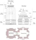 La estructura y disposición candi reconocen la jerarquía de las zonas, que abarcan desde los ámbitos menos santos hasta los más sagrados. La tradición índica de la arquitectura hindú-budista reconoce el concepto de organizar elementos en tres partes o tres elementos. Posteriormente, el diseño, planta y disposición del templo siguen la regla de asignación de espacio dentro de tres elementos; comúnmente identificado como pie (base), cuerpo (centro) y cabeza (techo). Son Bhurloka representados por el patio exterior y la parte de los pies (base) de cada templo, Bhuvarloka representado por el patio medio y el cuerpo de cada uno de los templos, y Svarloka que simboliza el techo de la edificación hinduista generalmente coronada con ratna (sánscrito: joya) o vajra.[cita requerida]
