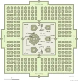 La superestructura principal del templo jemer típico es un prasat torreado llamado prang que aloja la cámara interior garbhagriha, donde residen el murti de Vishnu o Shiva, o un lingam. Los templos jemer estaban típicamente encerrados por una serie concéntrica de muros, con el santuario central en el medio; esta disposición representaba las sierras que rodeaban el monte Meru, el hogar mítico de los dioses. Los recintos son los espacios entre estos muros, y entre el muro más interno y el templo mismo. Los muros que definen los recintos de los templos jemer están frecuentemente cubiertos por galerías, mientras que el paso a través de los muros es a través de gopuras ubicadas en los puntos cardinales. La entrada principal suele adornarse con una calzada elevada con terraza cruciforme.[54]