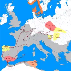 - ↑ J. Vicen Vives y J. Brun Margalef (1980). «XVII. Las invasiones germánicas». Atlas de Historia Universal. Barcelona: Teide. ISBN 84-307-7001-1.