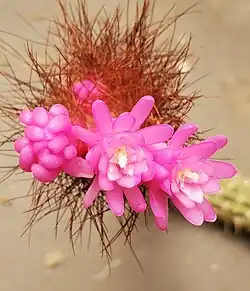 En las areolas encontramos de 1 a 3 espinas centrales rígidas, de 1 a 3 cm de largo y de 8 a 12 espinas radiales cortas muy finas. El cefalio está formado de lana blanca y cerdas largas de color marrón.