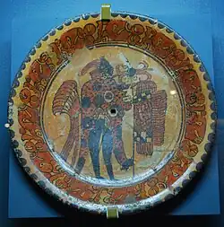 El arte se expresa en una variedad de medios, como la cerámica, el papel amate y la arquitectura.[9] Sin embargo, la mayor parte de lo que se conoce como arte mesoamericano proviene de edificios de piedra y cerámica, la mayoría de pinturas y relieves.[1] La cerámica data desde antes del periodo mesoamericano, probablemente comenzó como vasijas de cocina y almacenamiento, pero luego se adaptó al uso en rituales o en decoración. La cerámica era decorada por la forma, la pintura y los diferentes métodos de cocción.[10] La más antigua conocida era la puramente artística, con la cual se producían pequeñas figuras de cerámica que aparecieron en el área de Tehuacán alrededor del 1500 A.C. y se extendió a Veracruz, el Valle de México, Guerrero, Oaxaca, Chiapas y la costa de Guatemala en el Pacífico.[7] Las figuras más antiguas conocidas eran la mayoría de mujeres, que eran asociadas a ritos de fertilidad, debido a sus caderas y muslos de gran tamaño, así como figuras que cargaban bebés o de enfermeras; las figuras de hombres son en su mayoría representaciones de soldados.[12] La producción de estas figuras de cerámica, que también han incluido figuras de animales u otras formas, siguen siendo una parte muy importante del arte desde hace 2000 años. En el periodo olmeca, la mayoría de las figuras de cerámica eran producidas en tamaños pequeños, pero las esculturas de gran escala alcanzaban los 55 cm.[13][14] Después del periodo Pre-Clásico, la producción de esculturas de cerámica se redujo al centro de México, excepto en la Zona arqueológica de Chupícuaro. En las zonas mayas, el arte desaparece en el periodo Pre-Clásico, para volver a reaparecer en el periodo Clásico, en su mayoría en formas de silbatos o instrumentos musicales. En algunas áreas, como en Veracruz, la creación de figuras de cerámica continuó interrumpidamente hasta la conquista española, como artesanías, no como arte formal.[15]