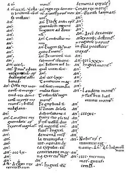 - ↑ "XCIII. Annus. Gueith Camlann, in qua Arthur et Medraut corruere; et mortalitas in Brittania et in Hibernia fuit." ("Arthurian references in the Annales Cambriae").