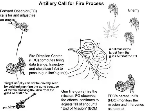 Debido a que la artillería es un arma de fuego indirecto, el observador delantero (FO) debe adoptar una posición en la que pueda observar al objetivo usando herramientas como binoculares y telémetros láser y llamar a las misiones de fuego en su radio o teléfono.