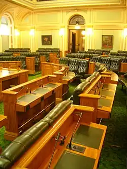 La Asamblea Legislativa de Queensland se encuentra en la Cámara del Parlamento en el distrito central de negocios de Brisbane. El edificio se completó en 1891. La cámara de la cámara baja está decorada en verde oscuro al estilo tradicional de Westminster. La cámara alguna vez contó con mesas centrales que dividían dos filas de bancos elevados a cada lado. La sala ahora está configurada en forma de U lejos de la silla del orador con tres filas de bancos que tienen sus propios escritorios y micrófonos.[6]