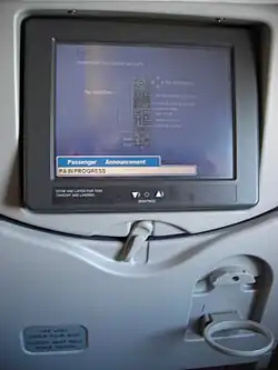 Los asientos pueden estar equipados con puertos de alimentación (ya sea EmPower, CA, CC o USB tomas de solo alimentación) para pequeños aparatos eléctricos y puertos para auricularess para el entretenimiento de audio. La mayoría de las aerolíneas de servicio completo también incluyen pantallas de video personales como parte del sistema entretenimiento a bordo en aviones de larga distancia, pero algunos aviones usan un sistema de traer su propio dispositivo donde los pasajeros usan sus propios dispositivos. Las pantallas suelen ser pantallas táctiles o pueden controlarse mediante dispositivos remotos. En Economy y Premium Economy, la pantalla normalmente está en el respaldo de un asiento, pero en un asiento de primera fila o en una cabina prémium, es posible que deban sacarse de un compartimento especial después del despegue y luego devolverse allí para aterrizar.