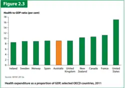 La relación gasto sanitario/PIB de Australia (9,9 %) en 2022-23 estaba ligeramente por encima de la media en comparación con otros países de la OCDE.[11]