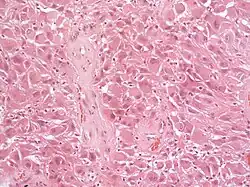 Histológicamente, son características de la lesión las células gigantes astrocíticas; sin embargo, la morfología de las células tumorales puede variar desde células poligonales con citoplasma vítreo y núcleos ganglioides hasta células fusiformes en una matriz fibrilar. Las células tumorales muestran una expresión variable de GFAP, S-100, sinaptofisina y neurofilamentos.