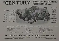 'Century Engineering and Motor Co' de Willesden Junction, Londres, produjo motocicletas desde 1902 hasta 1905. En 1904 su modelo de coche abierto en tándem estaba equipado con un motor Aster (de 5 hp o 6,5 hp, con radiador refrigerado por agua 'Begbie Audin') accionando un contraeje por cadena. El eje trasero era impulsado por una o dos cadenas, para dar velocidades altas y bajas. También se incluyó un modelo de carga para comerciantes.[4]