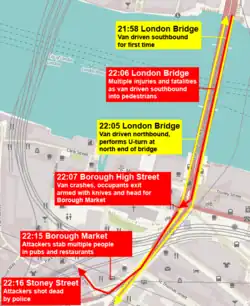 1. Metropolitan Police (3 de junio de 2017). «Info available at this stage: from 2208hrs officers responded to reports of a vehicle in collision with pedestrians on #London Bridge. 1/3». @metpoliceuk. Consultado el 3 de junio de 2017.
