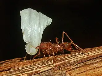 Las hormigas son del tipo podadoras de hojas y también cultivan un hongo basidiomiceto llamado Leucoagaricus gongylophorus (de la familia de los agaricáceos).[8] El ácido oleico es uno de sus factores desencadenantes.[9]