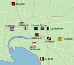 En 1896, varios equipos de la VFA rompieron su relación con la asociación y crearon su propio campeonato, que se disputó en los meses de invierno.[21][22] La Victorian Football League' (VFL) se constituyó oficialmente en 1877, con todos sus clubes procedentes de Melbourne y su área metropolitana, una situación que perduró hasta 1982. Los fundadores de la liga fueron Carlton, Collingwood, Essendon, Fitzroy, Geelong, Melbourne FC, St Kilda y South Melbourne.[22]
