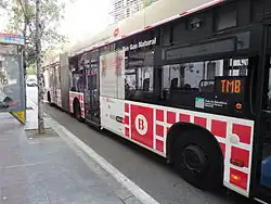 Unidad bi-articulada del Transmetro que sirve a la Ciudad de Guatemala y la Ciudad de Villa Nueva, Guatemala.
