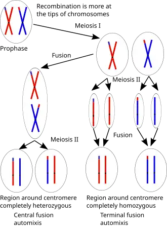 Si se produce una fusión terminal (meiosis restitutiva de la anafase II o la fusión de sus productos), un poco más de la mitad del material genético de la madre está presente en la descendencia y la descendencia es en su mayoría homocigota.[9] Esto se debe a que en la anafase II las cromátidas hermanas se separan y cualquier heterocigosidad presente se debe al cruce. En el caso de la endomitosis después de la meiosis, la descendencia es completamente homocigótica y tiene solo la mitad del material genético de la madre.