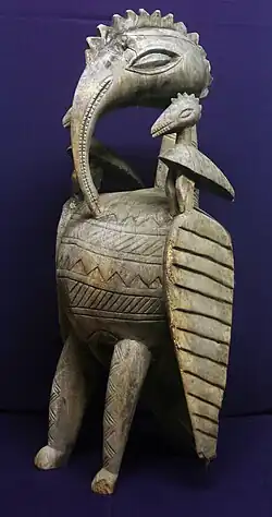 La figura del ave abstracta posee un largo pico curvado que llega hasta su panza. Las alas a cada uno de sus laterales con pequeños trozos rectangulares perforados adosadas al cuerpo. Dos pequeñas versiones del ave se alojan una en cada uno de sus hombros y las alas se encuentran decoradas con figuras en su anverso. Las patas se encuentran ligeramente dobladas, parada sobre un pedestal circular y un animal pequeño hace las veces de cola del ave. Esta escultura está fabricada con madera oscura y a veces se la decora con pigmentos o barro.