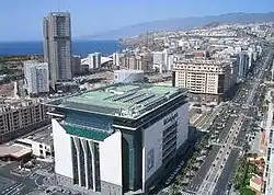 Avenida Tres de Mayo con el túnel Tres de Mayo al fondo. A la derecha el Rascacielos de la avenida Tres de Mayo y en primer plano a la izquierda el Palacio de Justicia de Santa Cruz de Tenerife. -