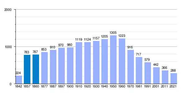 | Gráfica de evolución demográfica de Ayoó de Vidriales[13] entre 1842 y 2021 |