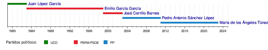 Actualmente, la alcaldía la ocupa María Ángeles Túnez García, que está al frente de un equipo de gobierno formado por los concejales del Partido Popular y la única concejala de Vox, que ocupa la segunda tenencia de alcaldía.
