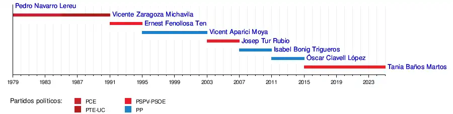 Gobierno 2023-2027 (12)[1] 9 PSPV-PSOE 2 Compromís 1 EUPV Oposición (9) 8 PP 1 Vox | |