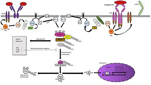 - Fosforilación: Se ha descubierto que en el momento de activarse los linfocitos T se induce la monofosforilación y bifosforilación de BCL10, a su vez se ha observado el S138 como uno de los lugares donde puede fosforilarse inducido por el receptor de linfocitos T. En esta función actúan las proteína denominadas CARMA1 (CARD11) y v-E10, se produce gracias a la exposición de estas con BCL10, al interactuar se induce la fosforilación de esta última y su vez la activación de NF-kB. CARMA1 se une a BCL10 a través de su motivo CARD e induce la translocación de BCL10 desde el citoplasma a estructuras perinucleares, mientras que el mismo proceso mediado por v-E10 depende de la translocación desde el citoplasma a la membrana. El receptor de linfocitos T (TCR) o de linfocitos B (BCR) activan la cascada de proteínas tirosina quinasas (PTK) y proteínas adaptadoras, esto causa la activación y reclutamiento de diferentes enzimas efectoras, como la fosfolipasa Cγ que pueden hidrolizar el fosfolípido inositol (PIP2) en trifosfato de inositol (IP3) y diacilglicerol (DAG), este último activa la proteína quinasa C (PKC) que finalmente induce la activación del NF-kB.[16]