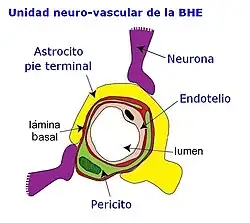 La barrera hematoencefálica es una estructura microvascular compleja, formada por células endoteliales, por los pericitos, la lámina basal abluminal, los astrocitos perivasculares y la microglía.[1]