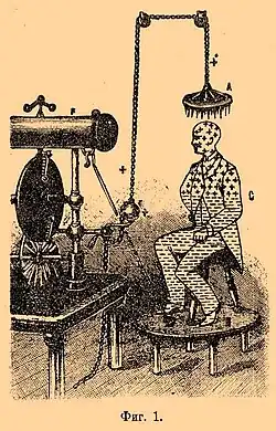La fuente de electricidad para un baño eléctrico solía ser una máquina eléctrica de fricción. El paciente se sentaba en un taburete de madera, y tanto el paciente como el taburete estaban aislados del suelo mediante una plataforma con patas de vidrio u otro aislante. En algunos casos, el paciente estaba acostado en lugar de sentado. Luego, se cargaba al paciente con electricidad estática, ya sea mediante conexión directa a un electrodo del generador (generalmente el positivo) o a través de inducción electrostática al sostener un electrodo grande cerca del cuerpo del paciente. La tensión eléctrica aplicada era de alrededor de 30–50 kV.[1] El tratamiento podía durar varias horas. Tras la carga, el paciente era «bañado» en electricidad, de ahí el nombre del procedimiento.[2] Esto podía observarse en una habitación oscura como una descarga luminosa alrededor del paciente, especialmente en el cabello y las extremidades.[3]