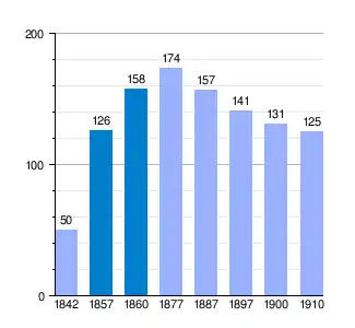 | Gráfica de evolución demográfica de Bañuelos de Rudrón[4] entre 1842 y 1910 |