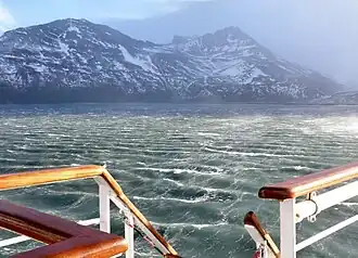 Debido a la presencia de tres glaciares y su altitud , la bahía está frecuentemente expuesta a vientos catabáticos que puede exceder de unos pocos minutos los 200 km/h.