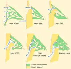 Los pasos de agua y los bancos de arena evolucionan durante la Edad Media por influencia de las mareas (se intercambian unos 370 millones de metros cúbicos de agua entre la bahía y el océano cada día, a una velocidad media de cerca de 2 m/s) y de las corrientes marinas (bordeando la costa del norte hacia el sur, arrastra alrededor de 600 000 m3 de arena al año). Estos factores convierten los pasos de agua especialmente peligrosos para la navegación. La localización y la estructura de los pasos siguen una evolución cíclica cuyo período es de unos 80 años, van disminuyendo progresivamente en la zona sur mientras que los situados más al norte son los que tienden a ampliarse. Por otro lado, la cuenca también es abastecida por agua dulce del río Leyre, que aporta un flujo continuo de agua, contribuyendo a impedir la obstrucción de los canales.