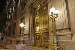 Una de las características del edificio es su gran puerta de bronce, que acompaña al edificio desde su fundación y a la que se accede ascendiendo por una escalinata central de cinco peldaños. La puerta fue construida por la Maestranza y Cerrajería Artísticas Carlos Mina e hijos. Hecha en dos pliegues, pesa seis mil kilos y tiene una altura de 6,2 metros y un ancho de 3,5 metros. El diseño cuenta con elementos clásicos característicos, siguiendo la línea del edificio, destacando la sobriedad decorativa. En el centro sobresale un par de aldabas y en sus segmentos laterales se acentúan piezas fitomorfas, en tanto que, en el módulo inferior de la hoja derecha, se observa una placa que dice “C. MINA e HIJOS, ERASMO ESCALA 3096-SANTIAGO DE CHILE”.[12]