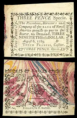 En 1783, el Congreso y varios estados, incluyendo Massachusetts, promulgaron una legislación que permitía a los ciudadanos americanos a pagar impuestos con certificados del Banco de Norteamérica, asignándoles la característica fundamental de moneda de curso legal.[13]