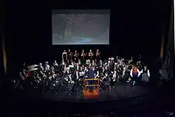![]() Banda de Música de Candás en marzo de 2025, en el Teatro Filarmónica de Oviedo, junto con el grupo de pandereteras "Compañeras". | ||