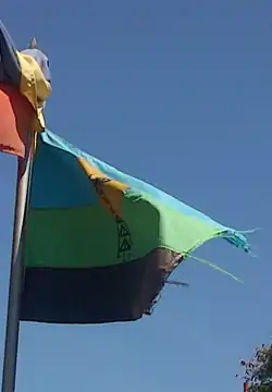 La bandera está dividida en 3 franjas horizontales, la superior del doble de tamaño que las otras 2 con un sol y un taladro como elementos centrales.