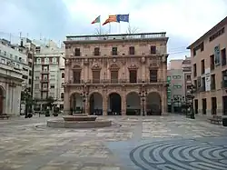 Más tarde, ejerciendo Codina de alcalde, el permiso para usar la bandera local se extendió para ser mostrada a diario, siendo una de las pocas banderas con la señera que ondeó en un edificio oficial durante el franquismo, aunque lo hizo debajo de las tres banderas oficiales de la época, la española, la falangista y la carlista, en el balcón central del tercer piso del palacio municipal. Se dice que según el ambiente político del momento las proporciones de la franja verde eran manipuladas, ensanchándola o adelgazándola según el gusto, si se dejaba ondear libre a la bandera o incluso se ataba al mástil para solo dejar visible la señera.[4] Allí siguió ondeando, excepto en las grandes ocasiones en la que se trasladaba al balcón central del edificio, hasta que en el año 1979 los símbolos falangista y carlista fueron reemplazados por la enseña preautonómica valenciana y la flamante bandera local, donde continua hasta la actualidad, también junto a la europea izada en los años 2000.