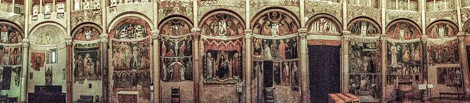 Fueron pintados desde el siglo XIII hasta el XV, con los respectivos cuencos de pintores de Emilia. El Maestro del 1302 hizo La madonne in trono con il bambino attorniata da un vescovo e un papa [La virgen en el trono con el niño rodeada de un obispo y un papa] y pintó el fresco votiva del obispo Gerardo Bianchi que representa a la la madonna con bambino attorniata da San Giovanni Battista, un angelo e dallo stesso vescovo Bianchi [Virgen con el Niño rodeada de San Juan Bautista, un ángel y por el mismo Obispo Bianchi]. De particular interés son las representaciones de San Giorgio che uccide il drago [San Jorge matando al dragón] y Santa Caterina atribuidos a Buonamico Buffalmacco y fechados en torno a 1330-1336. Otros pintores fueron Niccolò da Reggio y Bertolino da Piacenza. La mayor parte de estas pinturas son de carácter votivo y solo la pintura detrás del altar (El bautismo de Cristo) es trabajo de los mismos artistas de la bóveda.[5]