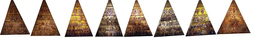 Las otras escenas en el techo representan diferentes historias en niveles horizontales del mosaico: (comenzando por el nivel superior) Coro de Ángeles, Tronos, Dominaciones, y Potencias; historias del libro del Génesis, historias de Joseph, historias de María y Cristo, y finalmente en el nivel más bajo: historias de San Juan Bautista. Algunas cabezas de profetas que se encuentran allí, se le atribuyen a Gaddo Gaddi, un amigo de Cimabue.