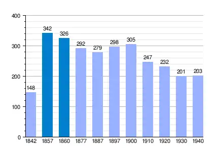 | Gráfica de evolución demográfica de Baraguás[1] entre 1842 y 1940 |