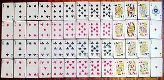 La baraja inglesa es un conjunto de naipes o cartas, formado por 52 unidades divididas en cuatro palos y 2 comodines adicionales.