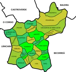 El municipio está formado por ciento once entidades de población[1] distribuidas en treinta parroquias:[2][3][nota 1]