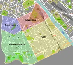El barrio está delimitado al norte por el boulevard Vincent-Auriol (conocido como boulevard de la Gare hasta 1976), al este por el Sena, al sur por los municipios de Ivry-sur-Seine y del Kremlin-Bicêtre y al oeste por la avenida de Choisy. Es el barrio más extenso de París con una superficie de 304,4 ha y una población estimada de 69.000 habitantes.[2]