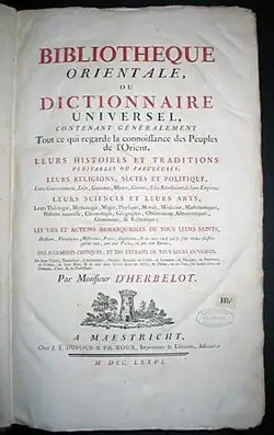 - ↑ El título completo de la edición de 1777-1779 es: Bibliothèque orientale, ou Dictionnaire universel contenant tout ce qui fait connoître les peuples de l’Orient. Leurs histoires et traditions, tant fabuleuses que véritables, leurs religions et leurs sectes, leurs gouvernemens, politique, loix, mœurs, coutumes et les révolutions de leurs empires, les arts et les sciences, la théologie, médecine, mythologie, magie, physique, morale, mathématiques, histoire naturelle, chronologie, géographie, observations astronomiques, grammaire et rhétorique, les vies de leurs saints, philosophes, docteurs, poëtes, historiens, capitaines, et de tous ceux qui se sont rendus illustres par leur vertu, leur sçavoir ou leurs actions ; des jugemens critiques et des extraits de leurs livres écrits en arabe, persan ou turc, sur toutes sortes de matières et de professions, par Mr. D’Herbelot. La Bibliothèque fue reeditada por Maestricht (1776), en Aja (4 volúmenes, 1777-1799), después en París (6 volúmenes, 1781-1783).