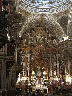 Todo el conjunto de la iglesia está repleto de una escenografía decorativa muy recargada, en su mayor parte realizada con pintura sobre cada uno de los distintos paramentos, rectos o curvos. La cúpula sobre el antepresbiterio está sostenida por cuatro columnas salomónicas de gran escala bajo la cual se encuentra la imagen de la Virgen de las Angustias.