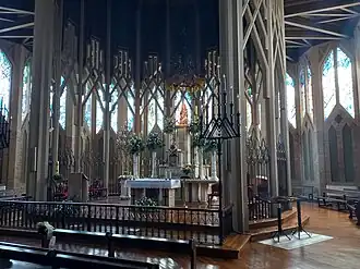 Aunque aún se conserva un atrio de acceso de esta época, entre 1929-1951 se levantó el templo actual, con base en los planos del arquitecto pamplonés Víctor Eusa que realmente ejecutó dos proyectos diferentes: uno en 1929 y otro en 1949. El primero, «con una mayor dependencia de los modelos de la Sezession y una concepción espacial» más sencilla, no prosperó mientras que en el segundo se pone de relieve «una mayor preocupación en la modelación del espacio» que notablemente reflejada «en la capilla mayor, concebida a manera de girola, tema fundamental del edificio resultando un recinto transparente y al mismo tiempo complejo.»[5]