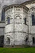 Esta riqueza ornamental se encuentra también en los muros exteriores de los colaterales y las capillas laterales del coro. Así, los muros de los colaterales se levantan en tres niveles, es decir, dos niveles de arcadas semicirculares separadas por un muro macizo. Contrafuertes-columnas separan grandes arcos adornados con dientes de lobo o abren, en la parte superior, grandes vanos románicos rematados por óculos, mientras que el nivel inferior da fe de una mayor sobriedad, pero retoma un patrón bastante cerrado. Así, pequeños vanos semicirculares iluminan la iglesia inferior. Finalmente, las capillas laterales desarrollan cuatro niveles de alzado: friso de arcos de medio punto en la parte superior, luego vanos enmarcados por columnillas alternadas con arcadas ciegas, muro macizo y nueva serie de vanos de medio punto en el nivel inferior.
