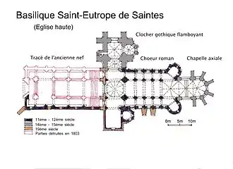 La iglesia, catalogada en estado de ruina por el prefecto Ferdinand Guillemardet, sufrió la amputación de su nave en 1803. Hasta entonces, Saint-Eutrope era uno de los edificios religiosos más grandes de la región: su nave cubría toda la plaza actual. También fue una de las más originales, por su división en iglesia alta e iglesia baja, con un sistema de escaleras reunidas en el centro de la nave que permitía el fácil tránsito de los peregrinos.