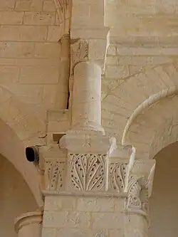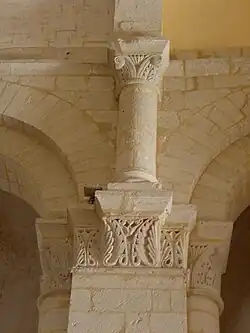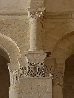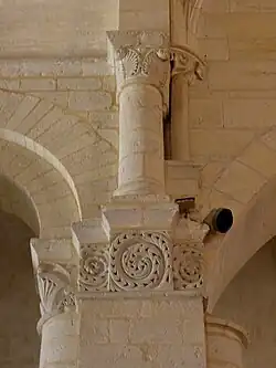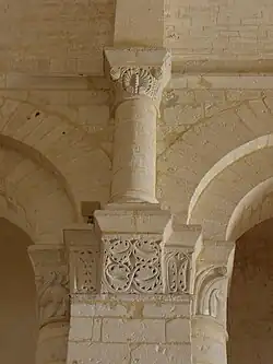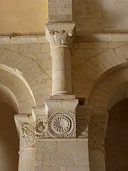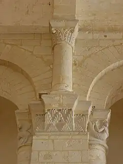 Cuatro pares de macizos pilares, con bases circulares o cruciformes, marcan el límite entre la nave principal y las naves laterales. Las esculturas de los capiteles, decoradas principalmente con motivos vegetales y entrelazados de inspiración antigua, constituyen uno de los conjuntos destacables del santuario. A la entrada de la iglesia inferior, una ancha banda compuesta por motivos florales bastante toscos presenta las características de la escultura merovingia. Podría tratarse de un elemento reutilizado de la antigua basílica construida en el siglo VI por el obispo Paladio.