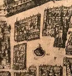 Plano de 1611 de Nancy: 42 la gran fuente, 5 iglesia parroquial de San Evre, 35 place de san Evre donde se celebraba la pescadería y el mercado de verduras.