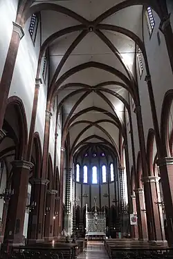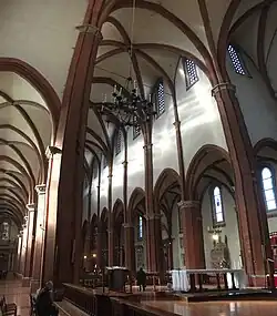El interior tiene tres naves puntuadas por pilares octogonales con altísimas bóvedas hexapartitas (en comparación con la altura de la basílica) (es decir, divididas en seis paños, como en Notre Dame en París ). En el coro hay un deambulatorio absidal con una corona de nueve capillas radiales.