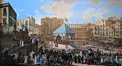 En 1809 Joaquín Murat, rey de Nápoles durante la ocupación napoleónica, ordenó la demolición de los antiguos conventos del Largo di Palazzo (la actual Plaza del Plebiscito) y convocó un concurso público para la realización de una nueva plaza. El arquitecto Leopoldo Laperuta fue encargado de la construcción del amplio hemiciclo sustentado por 38 columnas gigantes de orden dórico, que debía enfrentarse al Palacio Real y tomar como referencia la antigua tradición de las plazas porticadas, centro de las actividades políticas, económicas, sociales y culturales de la ciudad.
